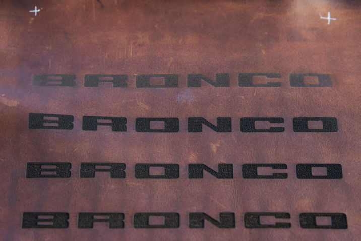 To excite customers and tease the Bronco before launch, the Ford design team created a one-off concept based on the 2-door Bronco. This vehicle was used to showcase Bronco's off-roading capability and modularity. The interior includes oil pull-up leather on all touchpoints, lasered logos on seat backs, and anodized orange finishes to match the Cyber Orange exterior paint.